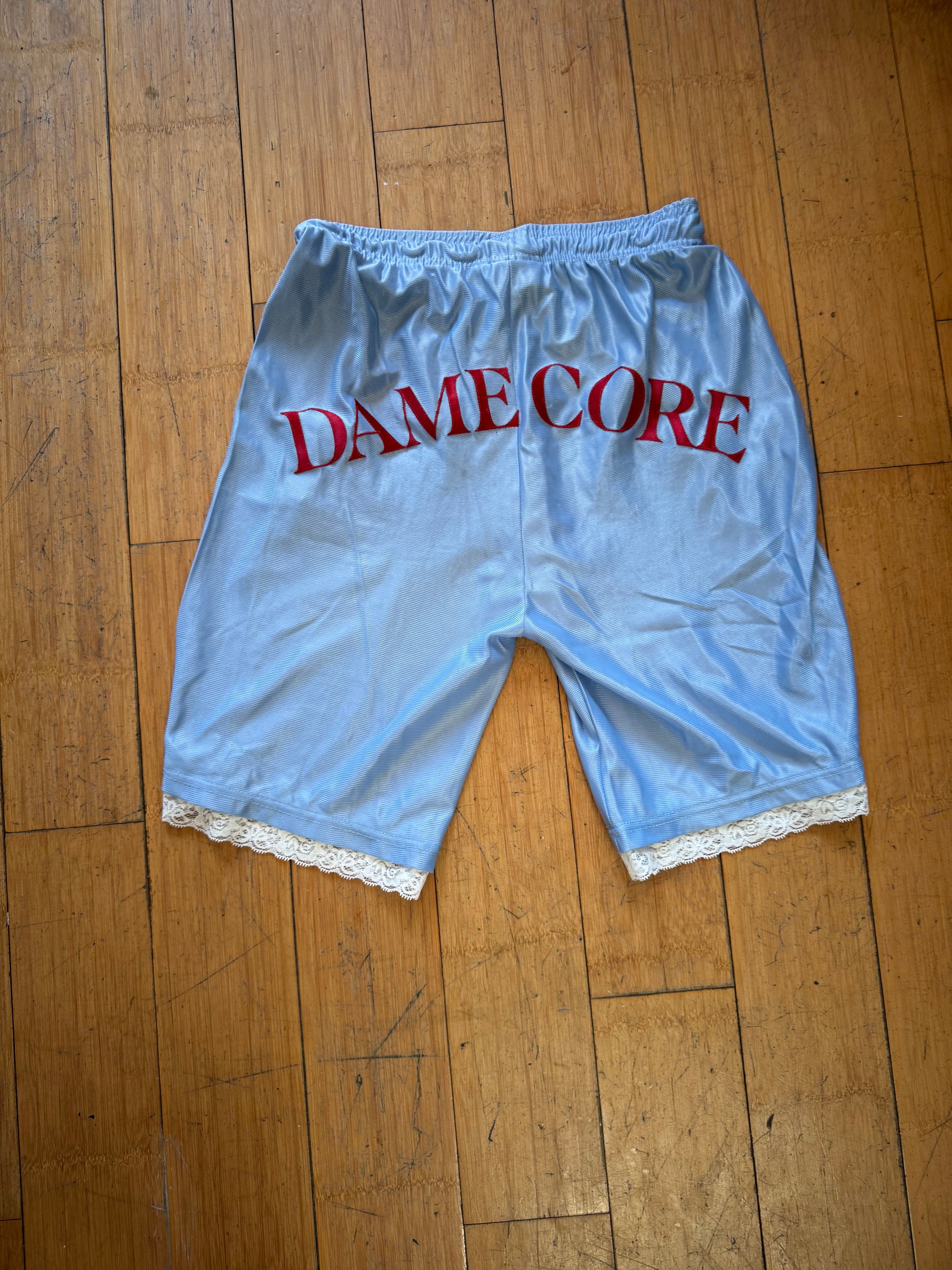 These one-of-a-kind reworked vintage basketball shorts are designed to turn heads—on the court, in the streets, or wherever you make your statement. Each pair features authentic retro mesh fabric reimagined with delicate lace trim and finished with the signature Damecore logo for that unapologetically bold energy.