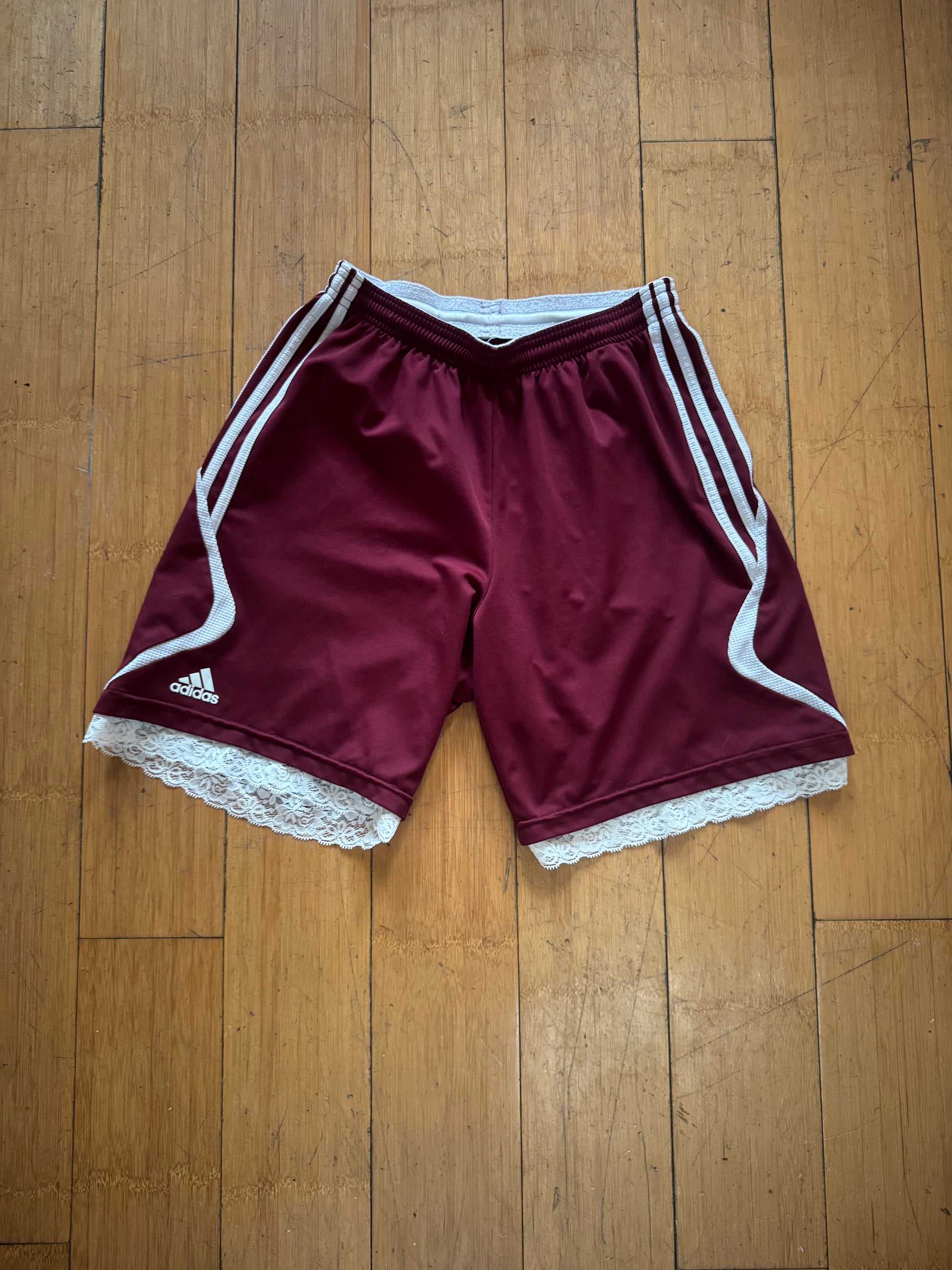 These one-of-a-kind reworked vintage basketball shorts are designed to turn heads—on the court, in the streets, or wherever you make your statement. Each pair features authentic retro mesh fabric reimagined with delicate lace trim and finished with the signature Damecore logo for that unapologetically bold energy.