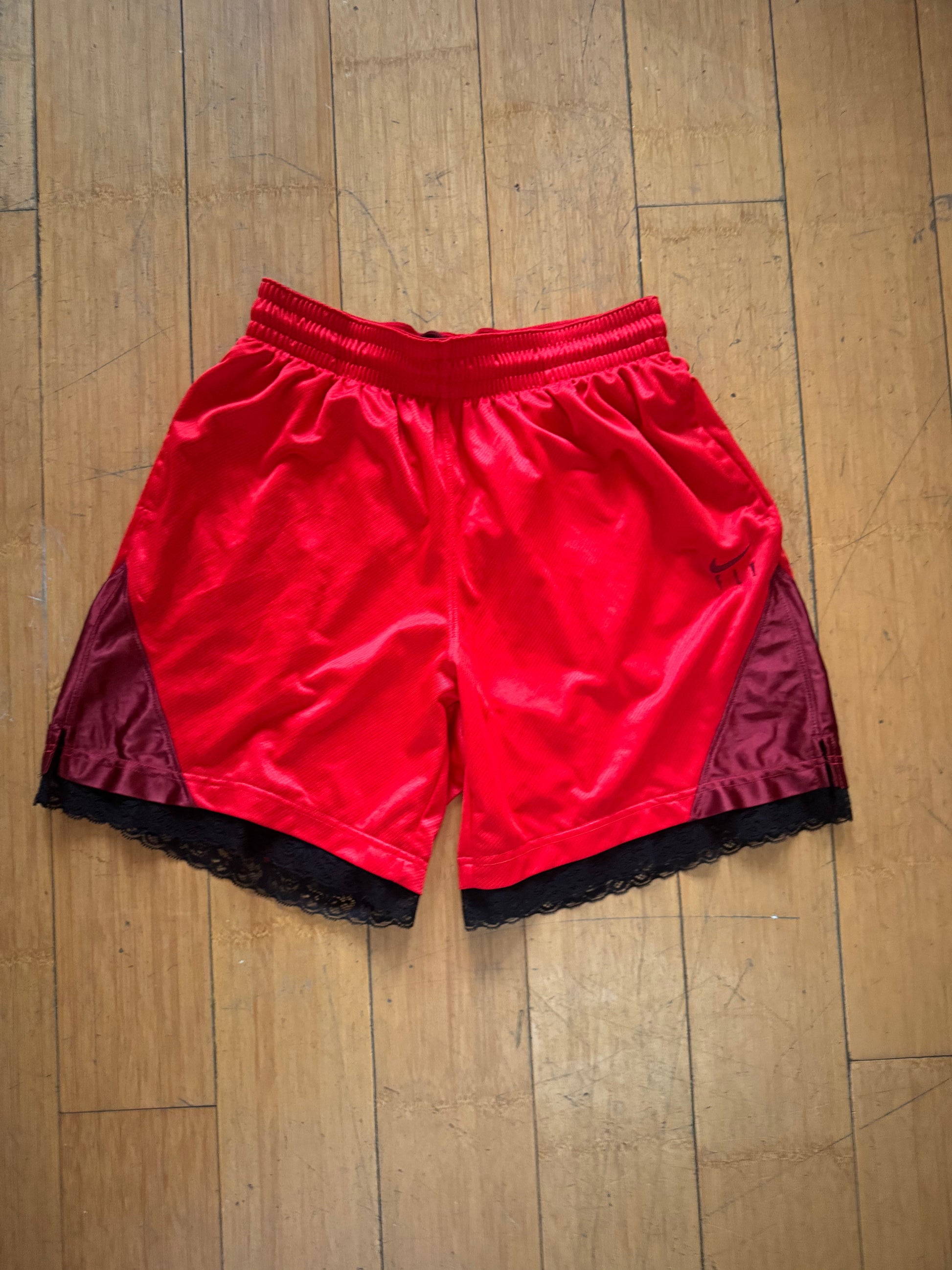 These one-of-a-kind reworked vintage basketball shorts are designed to turn heads—on the court, in the streets, or wherever you make your statement. Each pair features authentic retro mesh fabric reimagined with delicate lace trim and finished with the signature Damecore logo for that unapologetically bold energy.