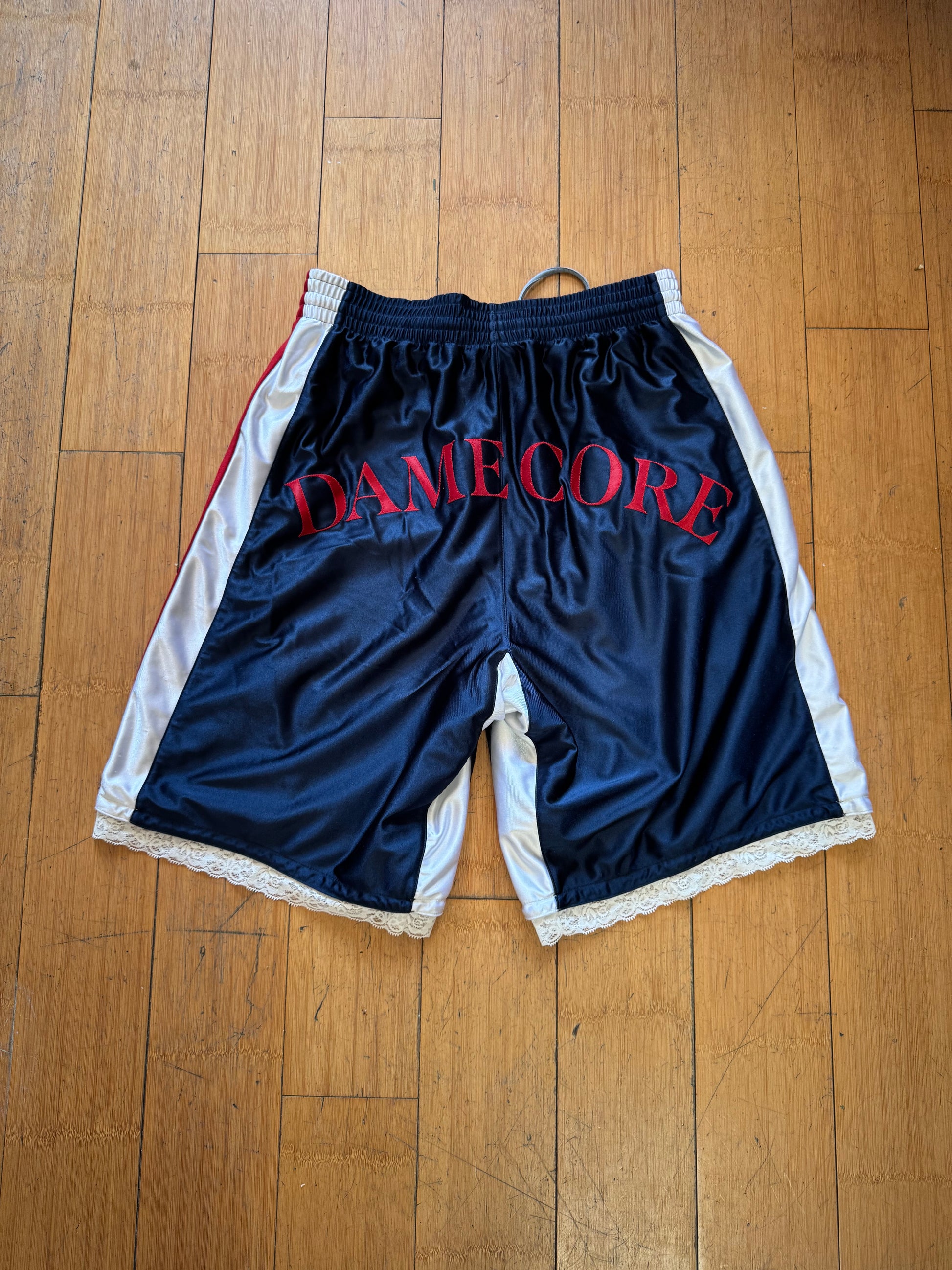 These one-of-a-kind reworked vintage basketball shorts are designed to turn heads—on the court, in the streets, or wherever you make your statement. Each pair features authentic retro mesh fabric reimagined with delicate lace trim and finished with the signature Damecore logo for that unapologetically bold energy.